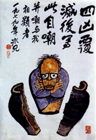 first cartoon he drew was "Self-Ridicule," which has become one of China's most famous cartoons and perhaps Liao's signature work. Enlightened by an article entitled "Practice Is the Sole Criterion To Test Truth," Liao reviewed his own past and depicted himself as emerging from a broken jar, folded tightly, not daring to move. He said the drawing reflected an entire generation of Chinese.