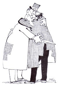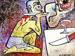 | Beginning with his first published cartoonin Shanghai's Time Cartoon magazine in 1932Liao's work has been hard hitting and bold. Never the lackey serving his head on a platter to a master, as he depicted in a 1936 cartoon (entitled "A Typical Lackey"), Liao tried to be his own man. As veteran Guangzhou political cartoonist Fang Tang, who is in his sixties, said of Liao, "He follows his own feelings, ideas, and opinions on behalf of the common people." |