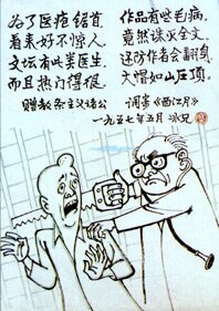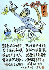 which remain because they were done "just for the occasion under the leftist trend then." But his career came to an abrupt halt after he was labeled a rightist in 1958. Liao had taken Mao at his word when the chairman called for more criticism of the Communist party, and had drawn a series of scathing cartoons. Two in particular that got him into trouble were "Colors Also Belong to Different Classes," in which different colored flowers were delineated as capitalists, workers, and reactionaries, and "To Cut Off His Head for Curing the Scab," in which an overzealous doctor is associated with censors who banned entire literary works because of a single offensive part. According to Liao, Guangdong officials liked the cartoons but the Beijing party leaders expressed extreme displeasure. "Zhou Enlai wanted to protect me, but no one could control the movement; after that, intellectuals were afraid to speak out," he added.